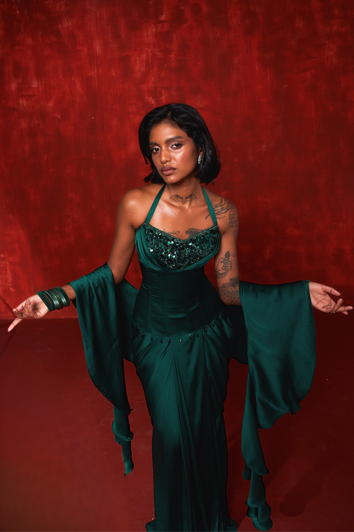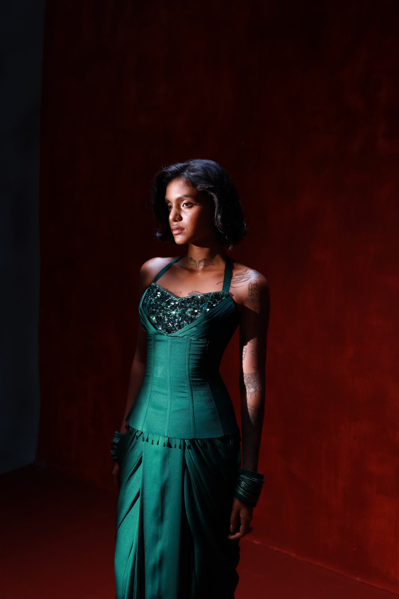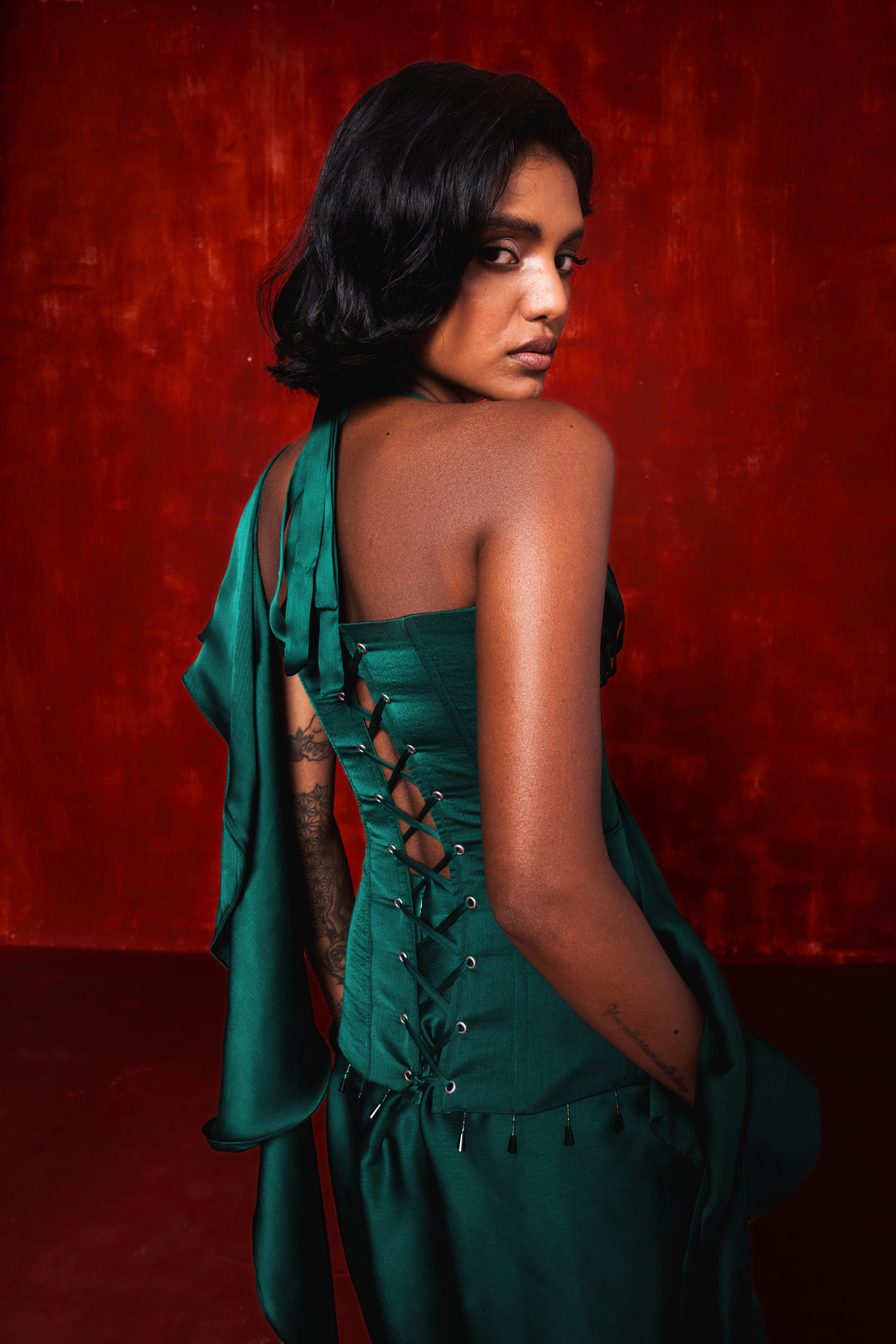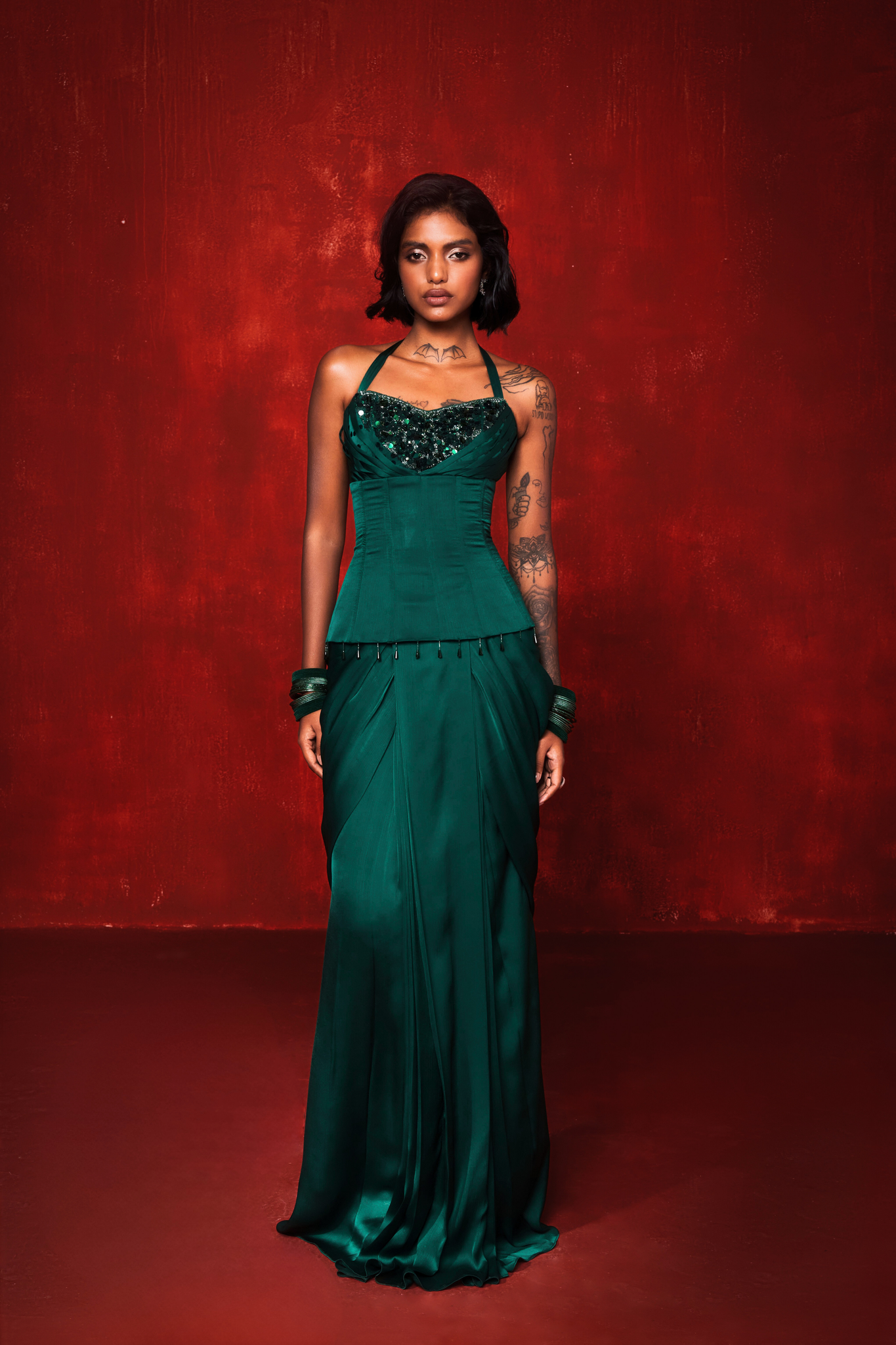 A sculpted vision in deep emerald, Arden is a statement piece crafted from 12 metres of rich satin chiffon. Its sharply contoured corset features boning and metal eyelet detailing, paired with a structured draped skirt and a sculptural ruffle dupatta.