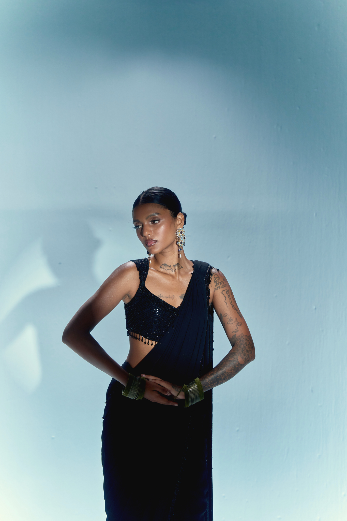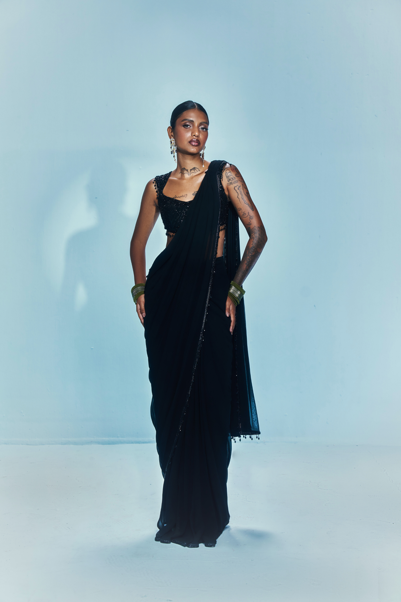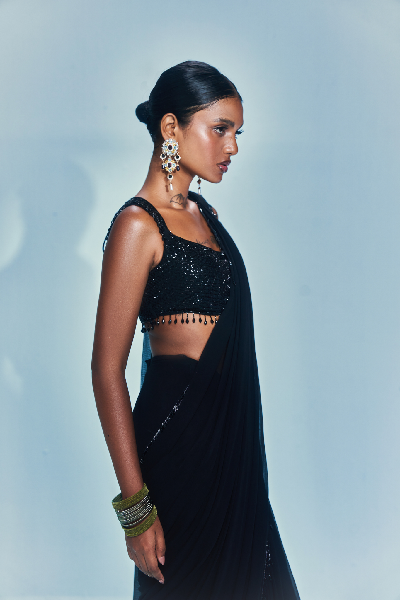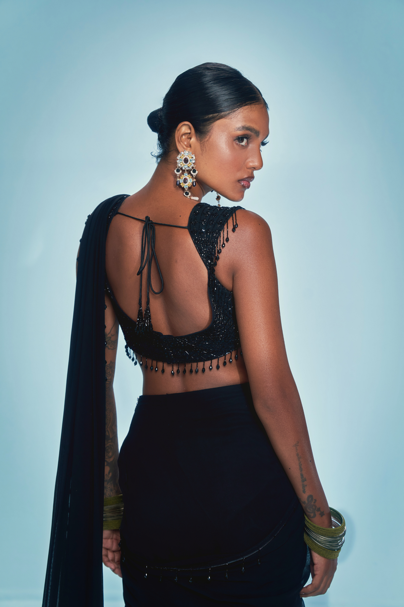 This ensemble features a hand-embroidered blouse crafted with glinting black sequins and cutdana, finished with cascading crystal tassels that play with every movement. The silhouette pairs a sculpted pre-stitched pallu, lending it that one-and-done drama — no draping needed.