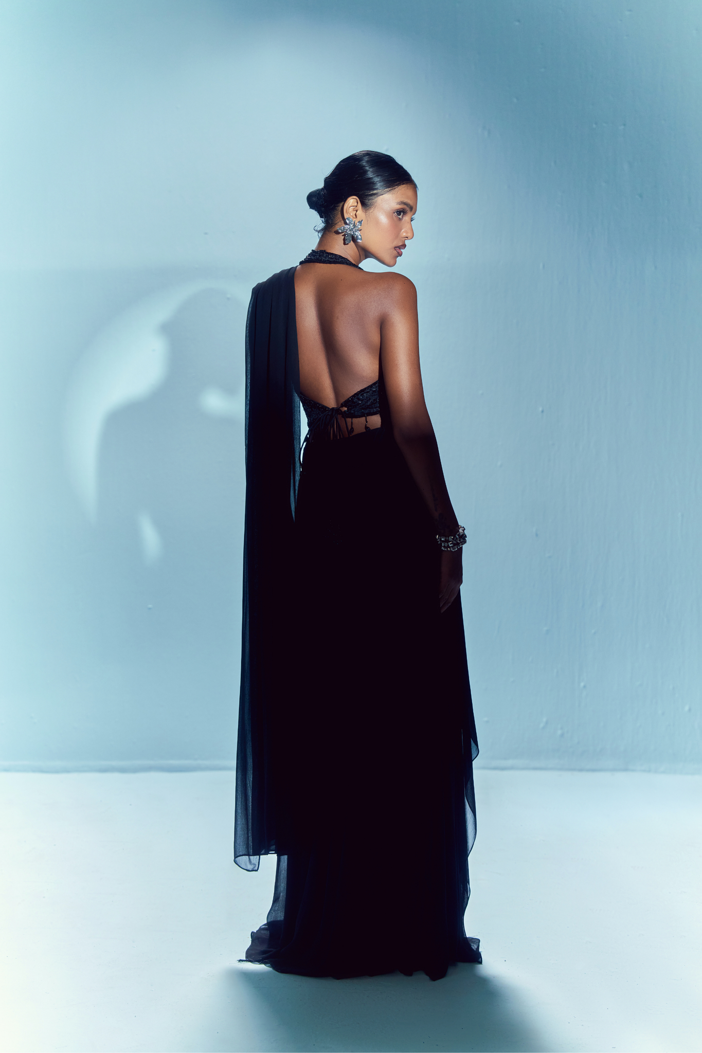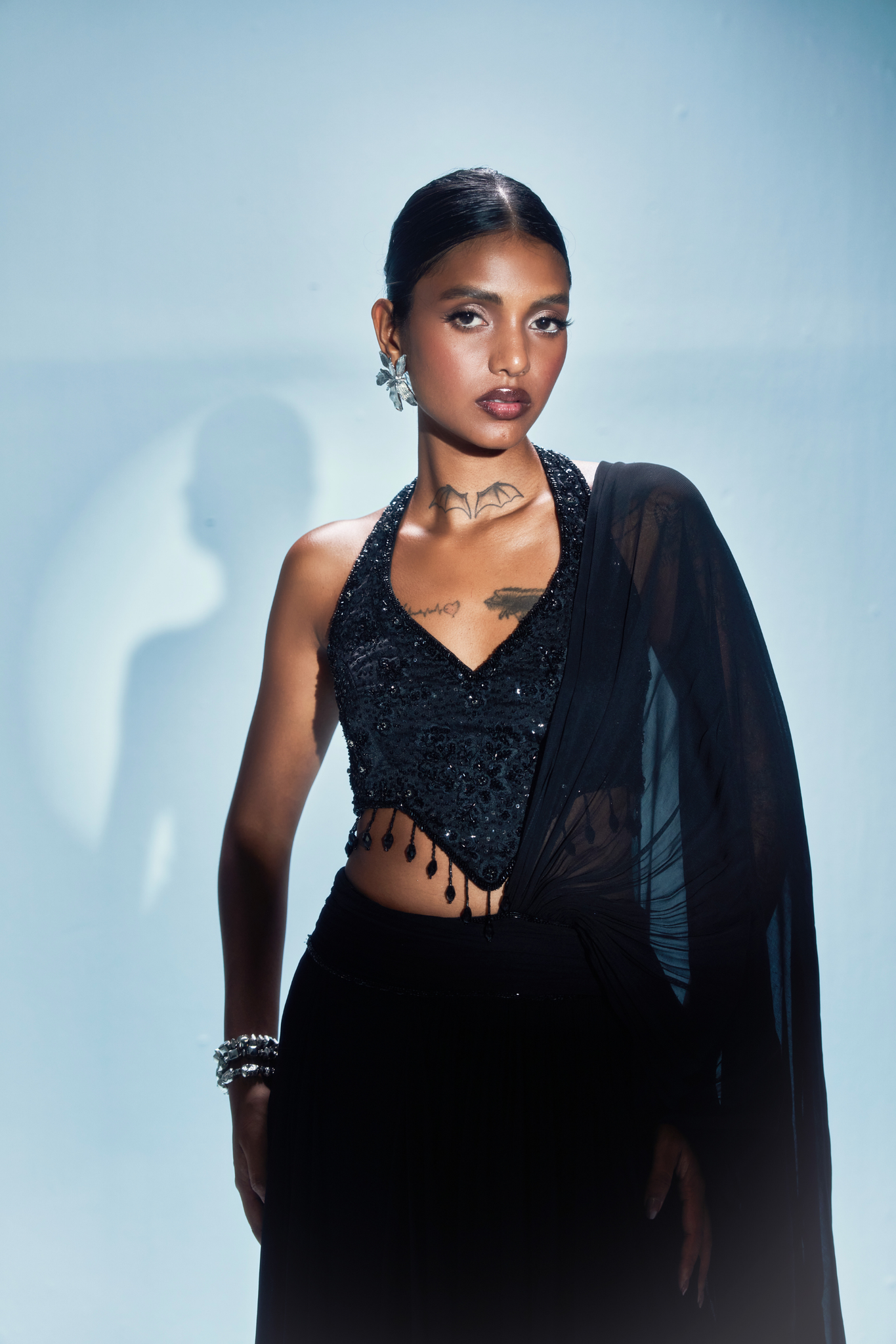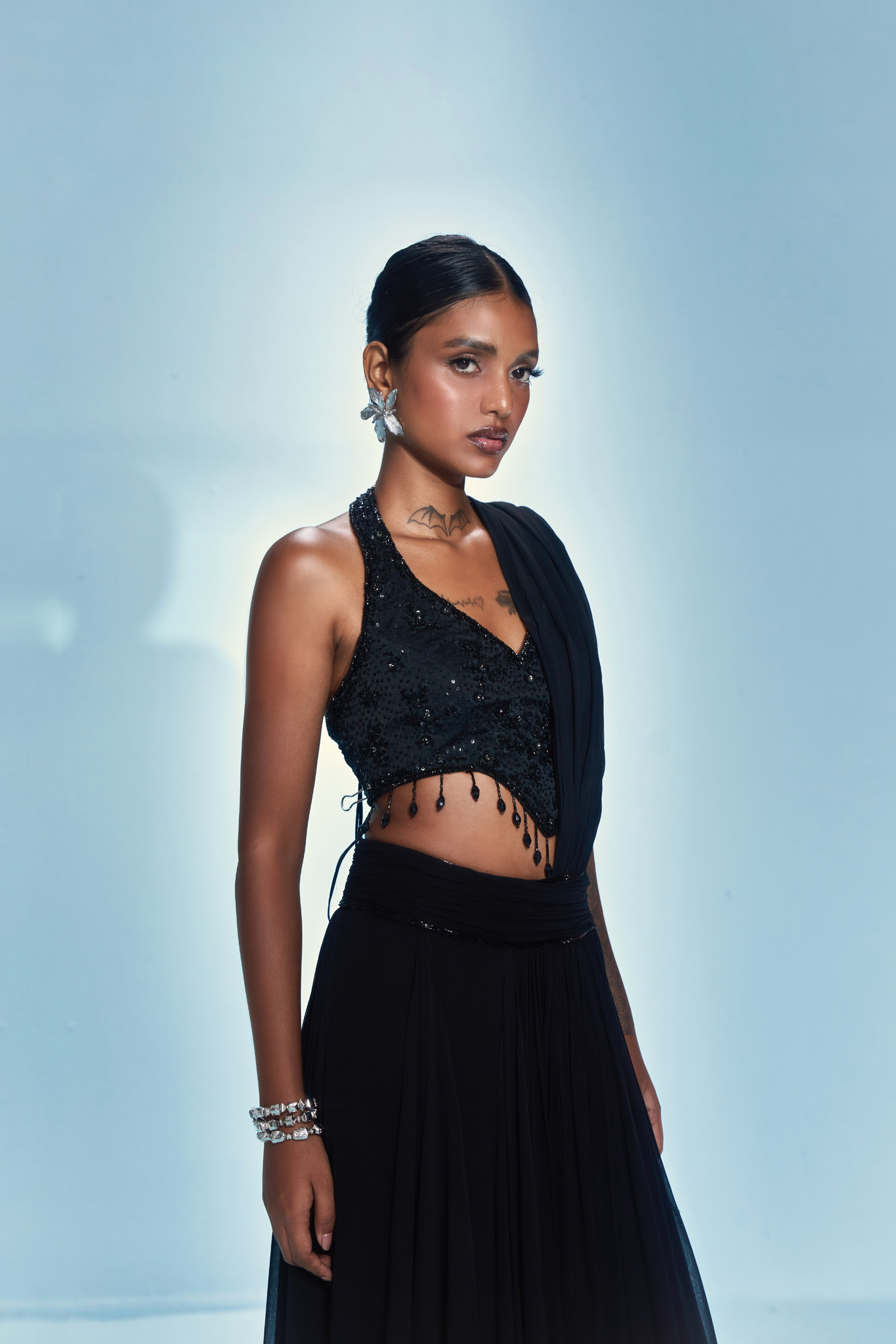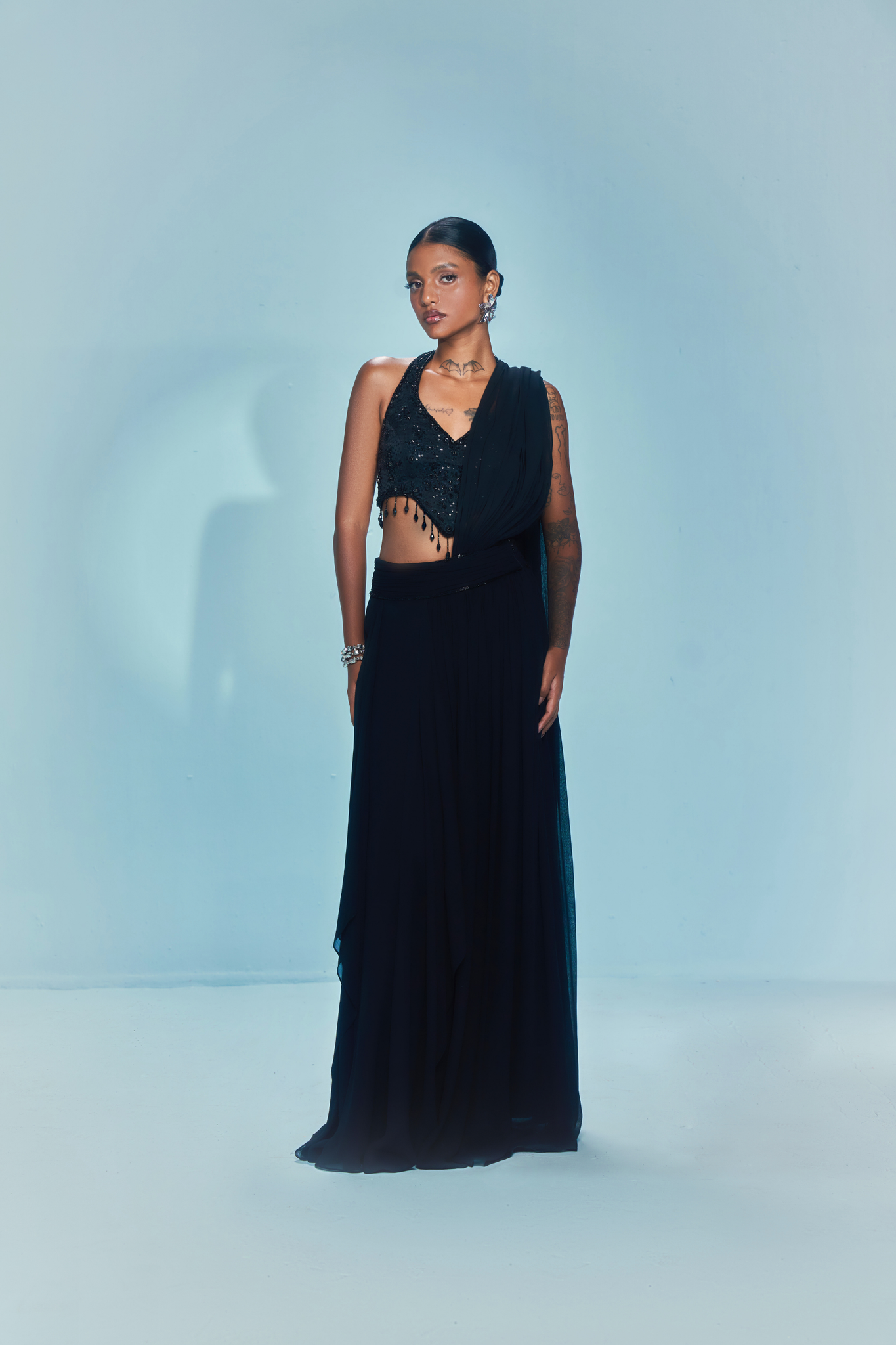 The Noctra concept saree features a handcrafted blouse drenched in sequin, cut-dana and resham embroidery, accentuated with delicate crystal tassels at the hem. The lehenga-style skirt drapes into an attached pallu, fusing the elegance of a saree with the ease of separates.