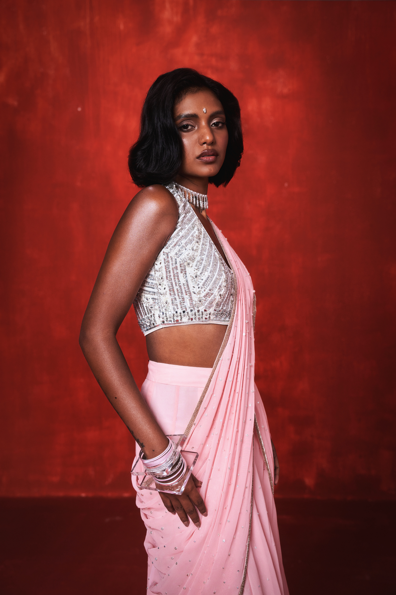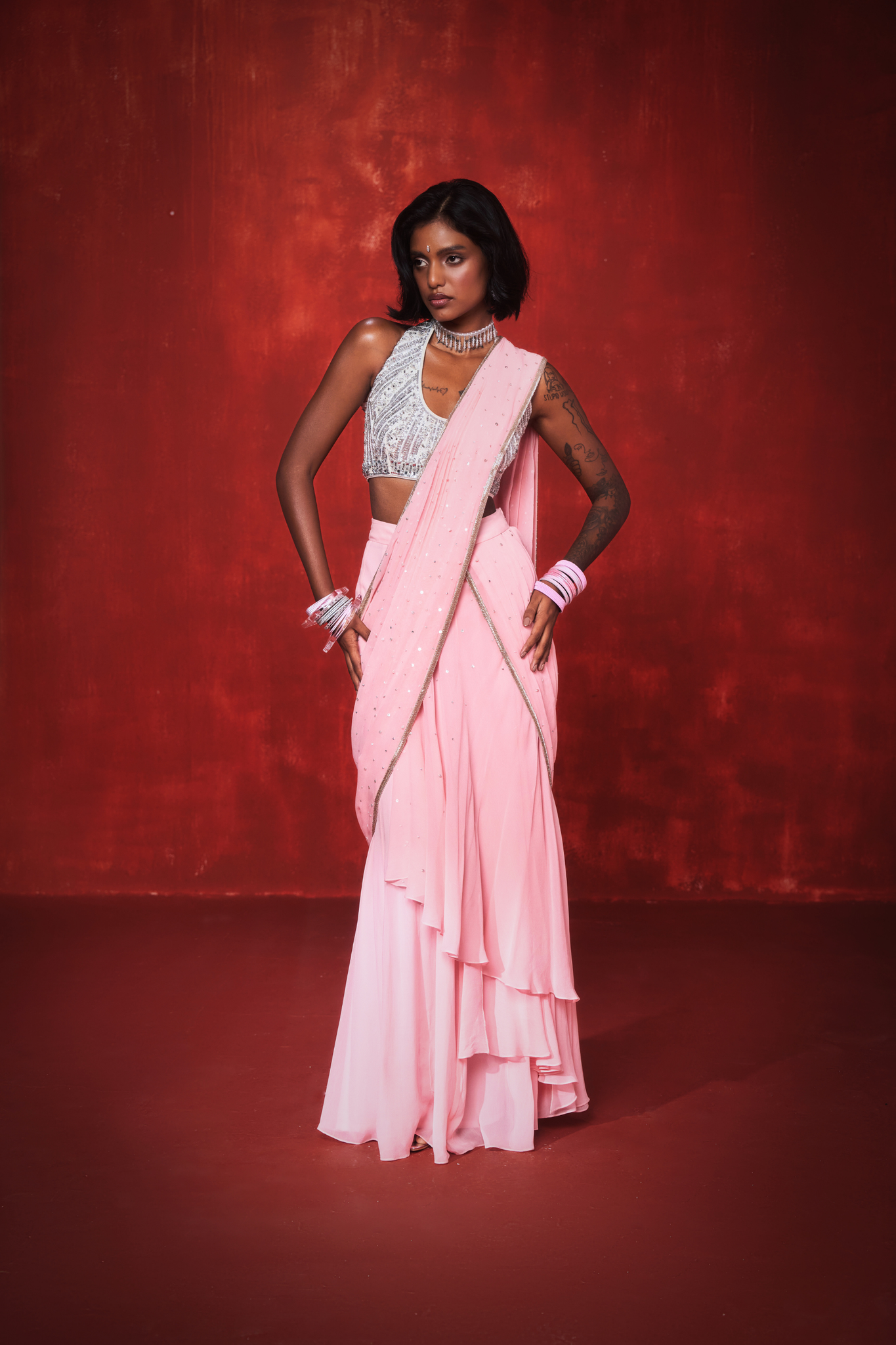 A blush-toned pre-draped saree reimagined for the modern muse. The set features a georgette saree with cascading pleats and a pre-draped pallu that glides effortlessly, paired with a fully hand-embroidered halter style blouse. The pallu is adorned with a soft shimmer of sequins across the panel.