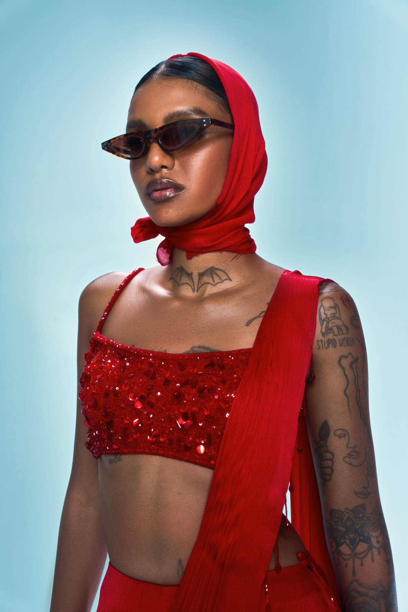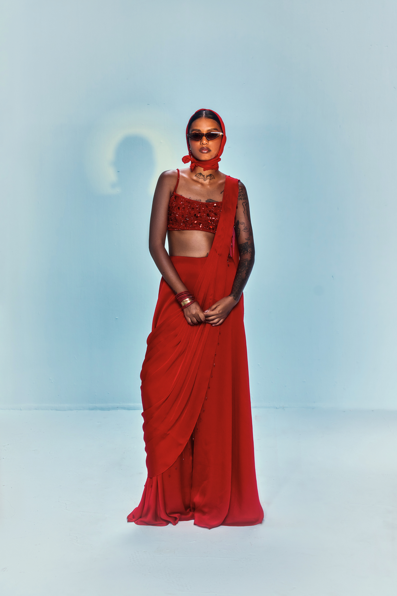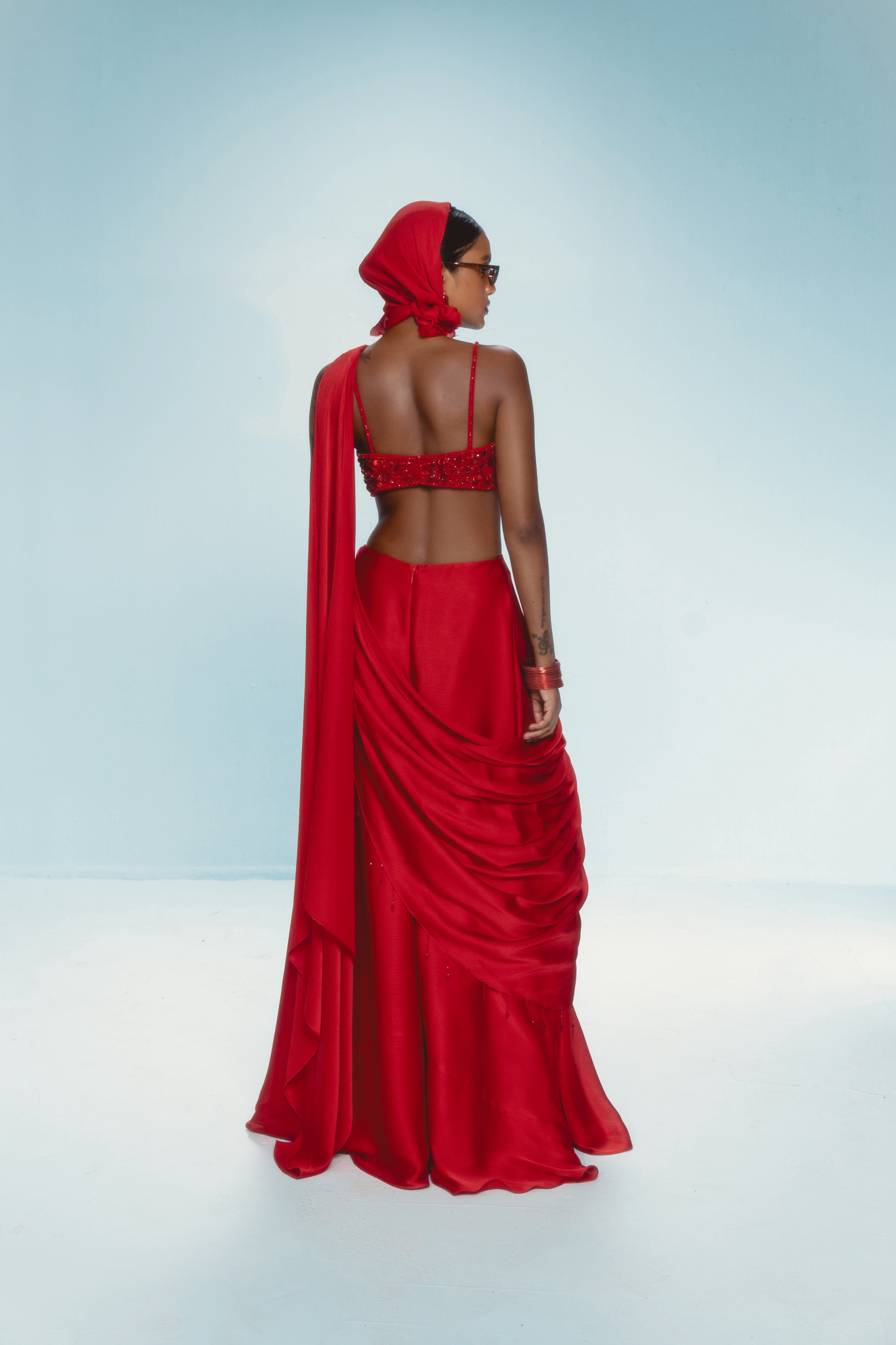 The Scarlet Mirage set includes a handcrafted scarlet blouse embellished with sequins, cut dana, rhinestones, and crystal stones—paired with wide chiffon satin sharara pants and a pleated pallu that you can wear on or off. Versatile enough to be worn as a saree or as a statement coord, depending on your mood.